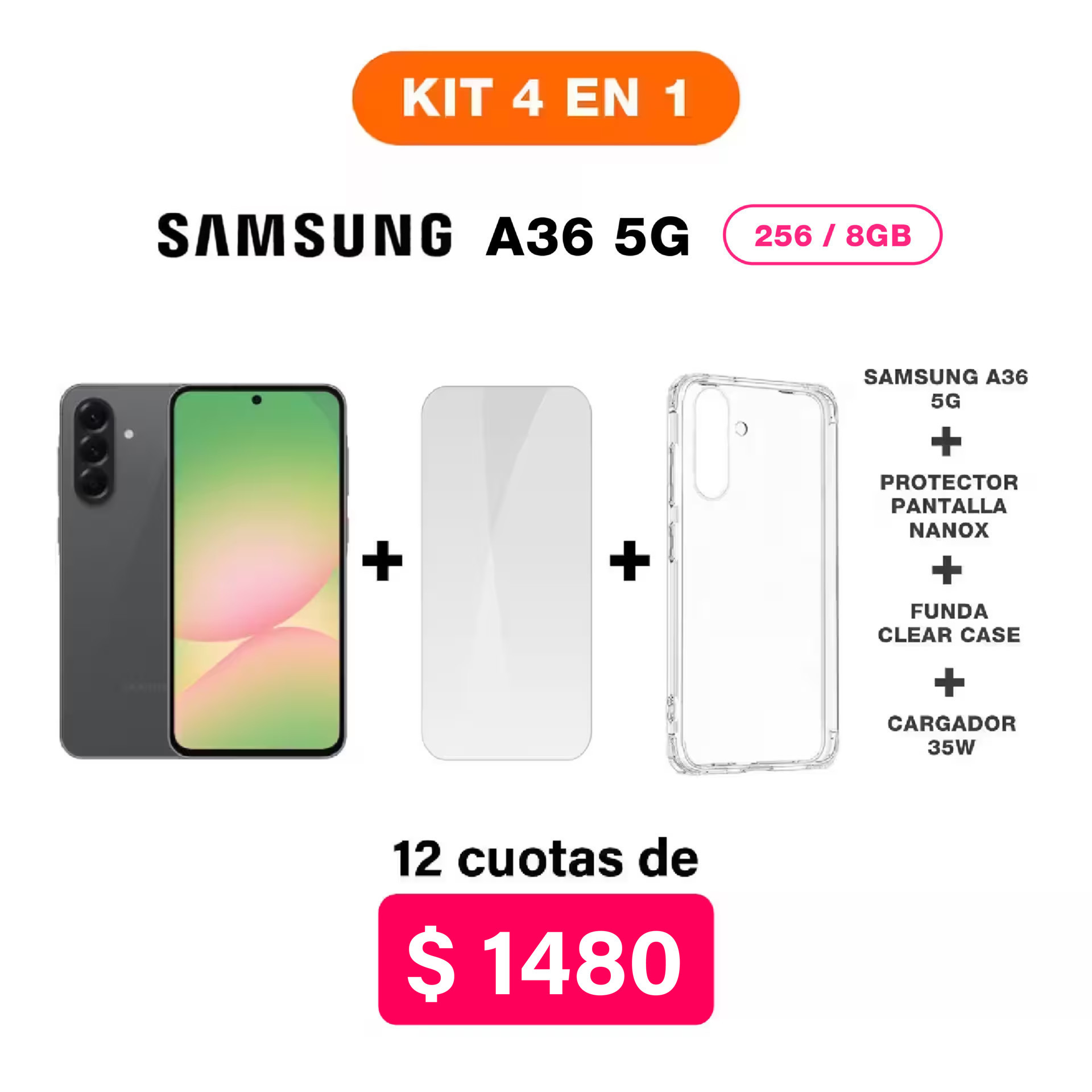 KIT 4 en 1 -Samsung A36 5G de 256/8GB de memoria RAM que incluye un cargador de 35W, una lámina de Nanotecnología y una funda transparente reforzada y super resistente!